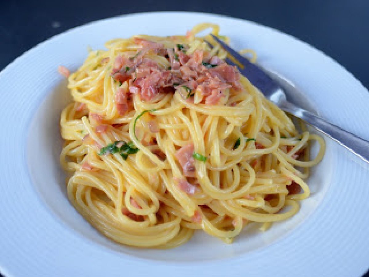 Den Schinken in kleine Würfel und braten, würzen mit Paprika und Pfeffer und vom Herd nehmen.