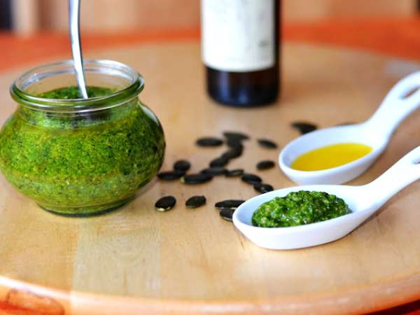- Wenn das Pesto sein zu fest noch zu Olivenöl darunter mischen. In einer Glasflasche, luftdicht verschlossen und im Kühlschrank. Oder sofort servieren.