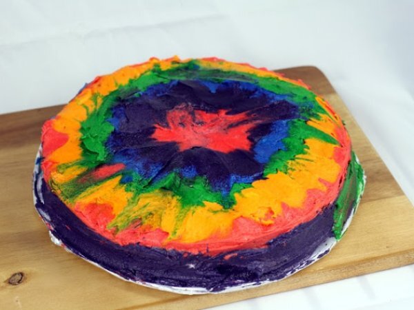 Legen Sie einige rote Zuckerguss in der Mitte und dann die anderen Farben um ihn herum einen Zyklus von Schichten außerhalb wieder einen roten Glasur Ring. - Farben immer mit einem Löffel eigene Mitte verwischt. Hier vielleicht zwischen jeder Farbe eingestellt, weil sonst alles, was ist violett.