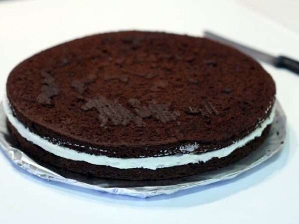 - Anschneiden der Torte in zwei nach dem Abkühlen und geben eine Schicht aus Zuckerguss zwischen ungefärbten.