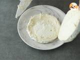 Schneiden Sie den Brie in zwei Hälften und entfernen Sie den oberen Teil.
