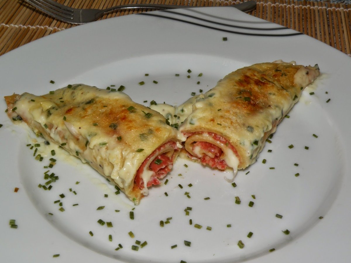 - Einen Löffel Béchamel schon mal in eine Auflaufform geben und verteilen. Auf jedem Crêpe nun Salami und Mozzarella legen. Das Ganze dann aufrollen und in die Form schichten.