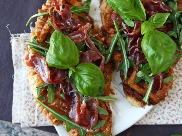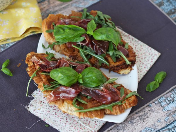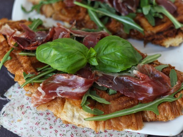 Croffle, das croissant in waffelform mit feigenkonfitüre, ziegenkäse und iberischem schinken
