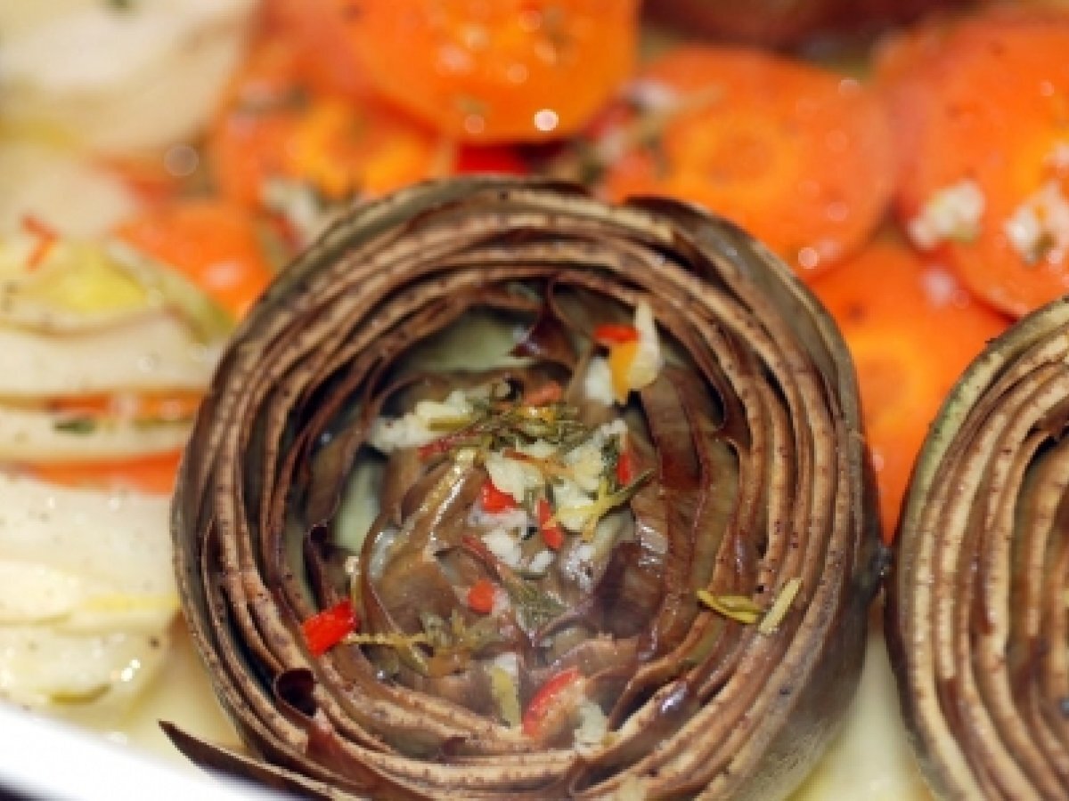 Dampfende frische artischocken, fenchel und karottenstücke in knoblauch und chili