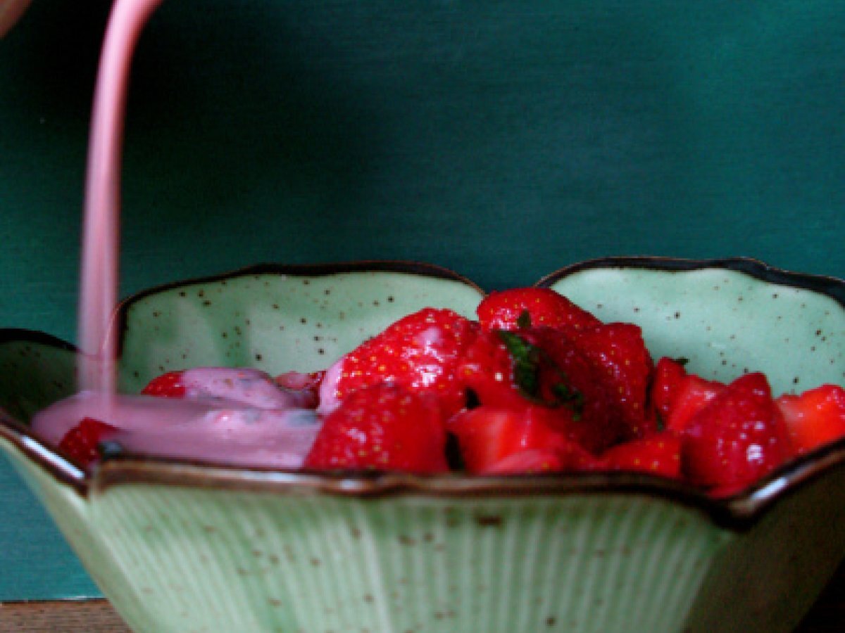 - Kurz vor dem Servieren gefrorene Erdbeeren aus dem Gefrierschrank und mit Erdbeersauce mischen.