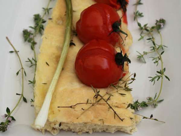 - Strauchtomaten mit Stiel abwaschen und trocken tupfen. Auf dem Teig verteilen. 3 Frühlingszwiebeln putzen und auf dem Blech verteilen. Mit Lavendelblüten und Thymianzweigen belegen.