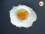 Beginnen wir mit der Zubereitung der Eiernudeln: Gießen Sie das Mehl auf eine Arbeitsfläche (oder auf ein Backbrett), formen Sie den Krater und fügen Sie die ganzen Eier hinzu.
