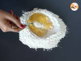 Nehmen Sie nun den Teig, entfernen Sie die Folie und teilen Sie ihn in vier Teile. Drücken Sie jedes Stück flach und beginnen Sie, es mit der Tirapasta (oder mit einem Nudelholz auf einer bemehlten Arbeitsfläche) zu verarbeiten, bis Sie eine dünne Eierplatte von etwa 1 bis 2 Millimetern erhalten