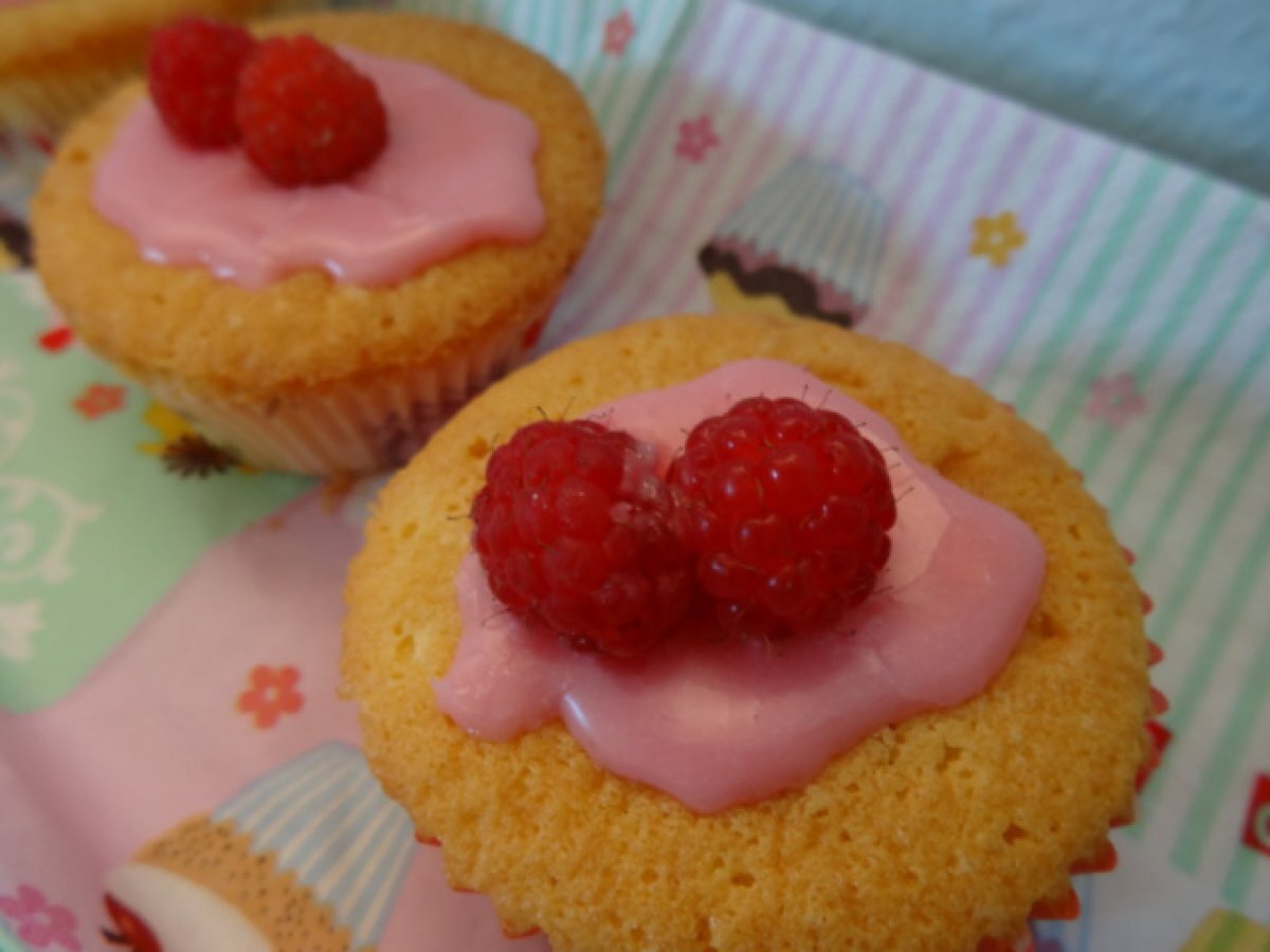 - Mit einigen Tropfen Lebensmittelfarbe einfärben. Den Zuckerguss auf die Muffins verteilen und mit Himbeeren dekorieren.