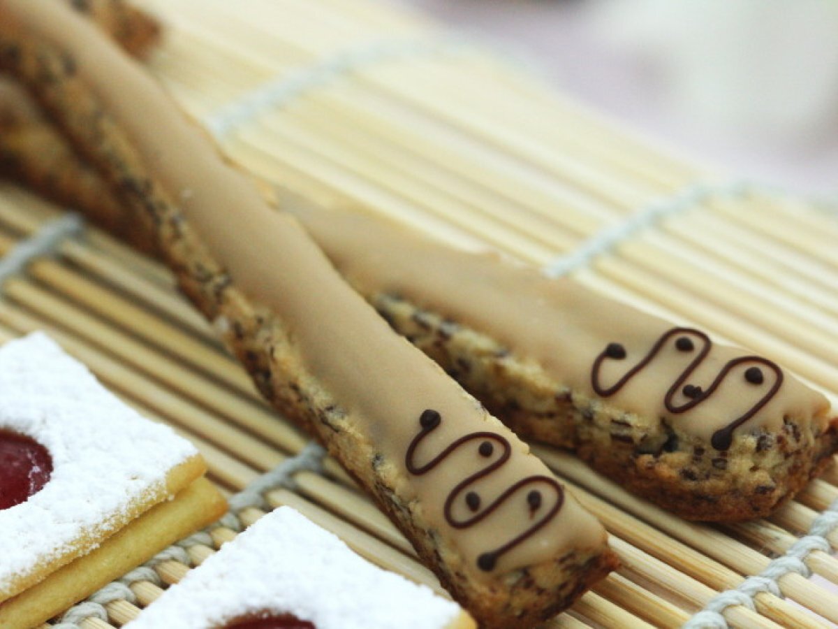 - Sich eine Schablone aus einem Pappkarton ausschneiden in Stäbchenform. Den Teig auf 8 mm ausrollen und kühl stellen. Dann mit der Schablone und einem Rollmesser die Stäbchen ausschneiden.