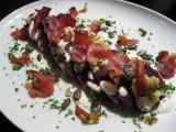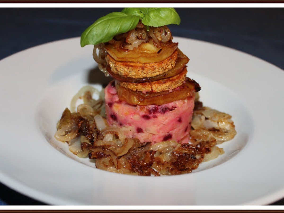 Karamellisierter tofu nach berliner art auf rote-bete-kartoffelpüree