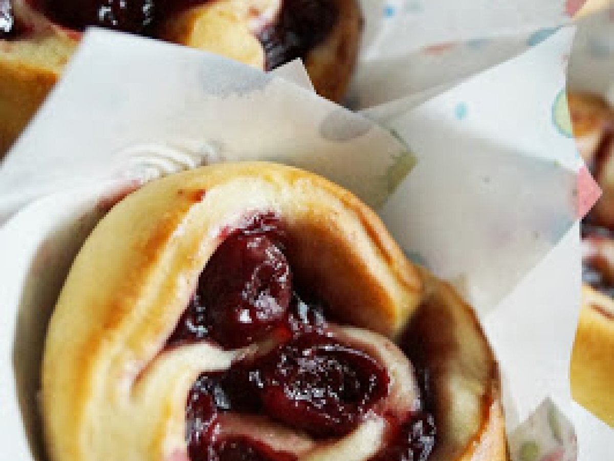 - Kirschen mit Erregung die Masse abkühlen zu lassen. Den Teig auf einer erneut mit Mehl bestäubten Oberfläche kneten. Den rechteckigen Teig herabsetzen und gehen hinein, das Füllen auf dem Teig überzugehen.