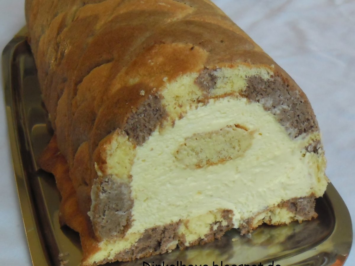 - Unter den restlichen Biskuitteig 1-2 EL Kakaopulver unterrühren, in den Spritzbeutel füllen und die Zwischenräume mit dem dunklen Teig füllen.