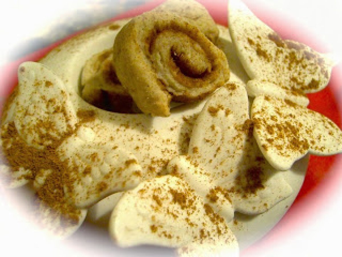 - Den Teig dünn ausrollen und mit Zimt und Zucker bestäuben. Jeweils 2-3 mal einrollen, dann abschneiden.