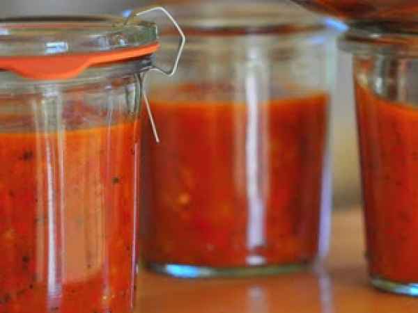 Schneiden Sie die Paprika Hälften in dünne Streifen. - In einem Topf mit Olivenöl 2 Esslöffel können heiß sein, rühren reinen Karotten, Zwiebel, Knoblauch und Paprika-Streifen.