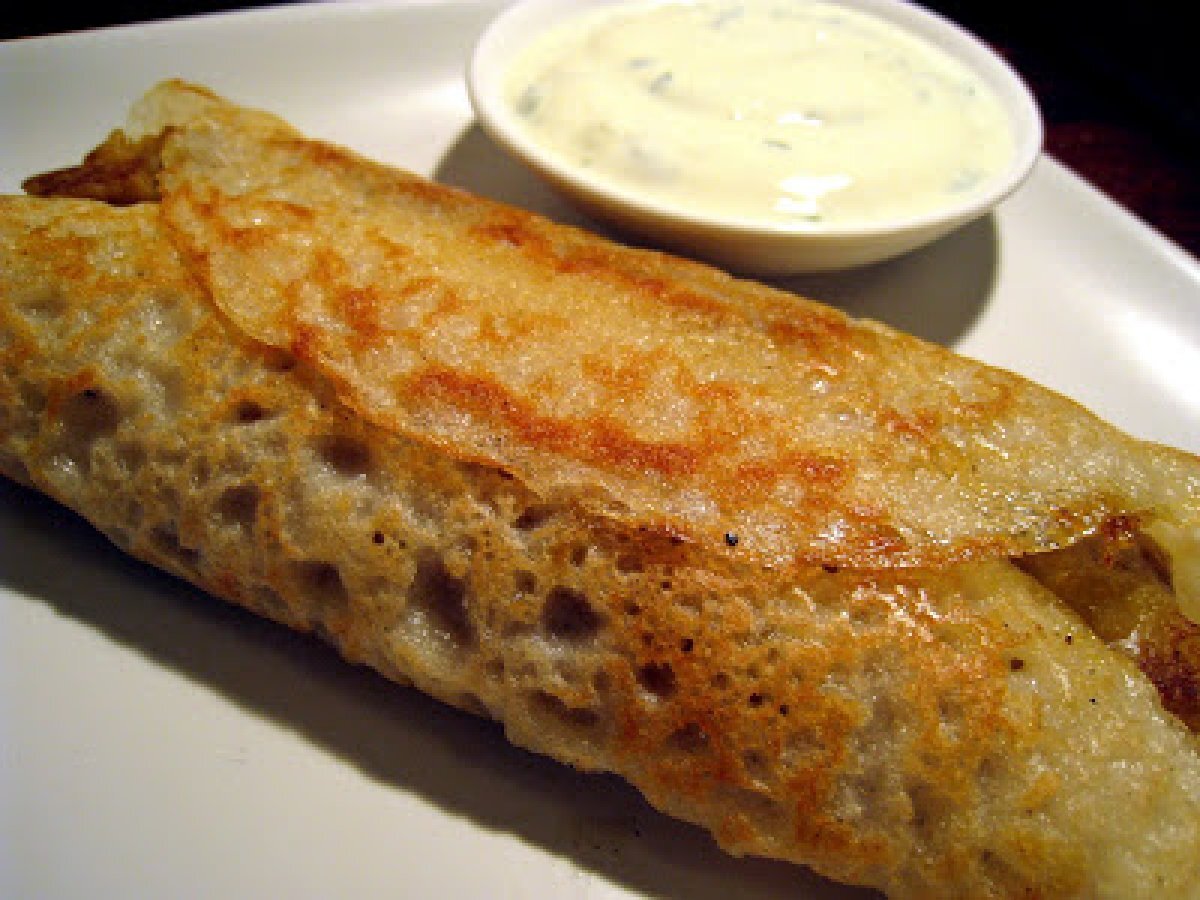 Den Teig zu einem dünnen Pfanne mit Butterschmalz ausgepinselte gusseinserne und lassen braten leicht. - In Kartoffel-Mischung auf, Nieselregen mit Ghee. Die Seiten falten und rundrum braun.