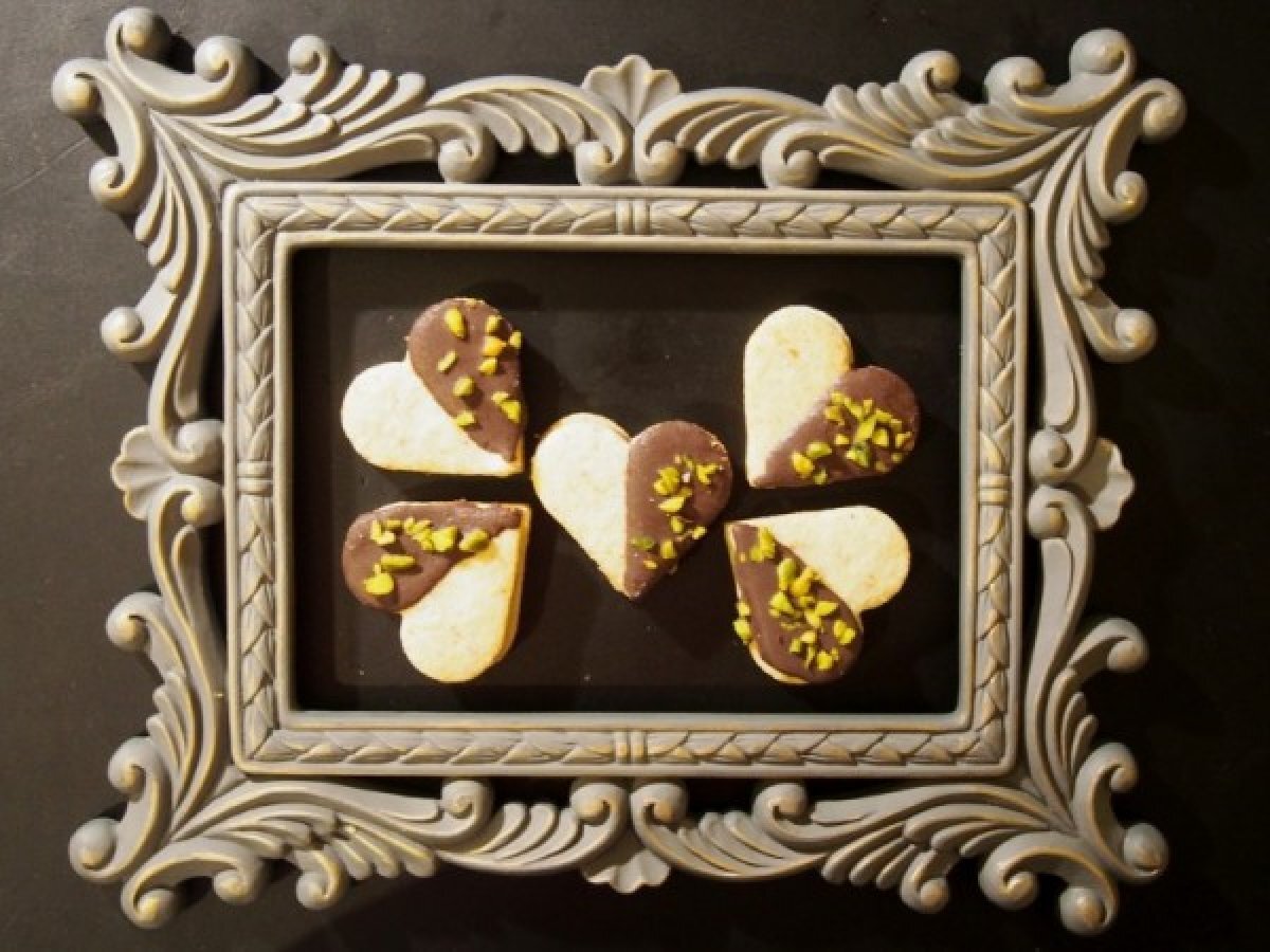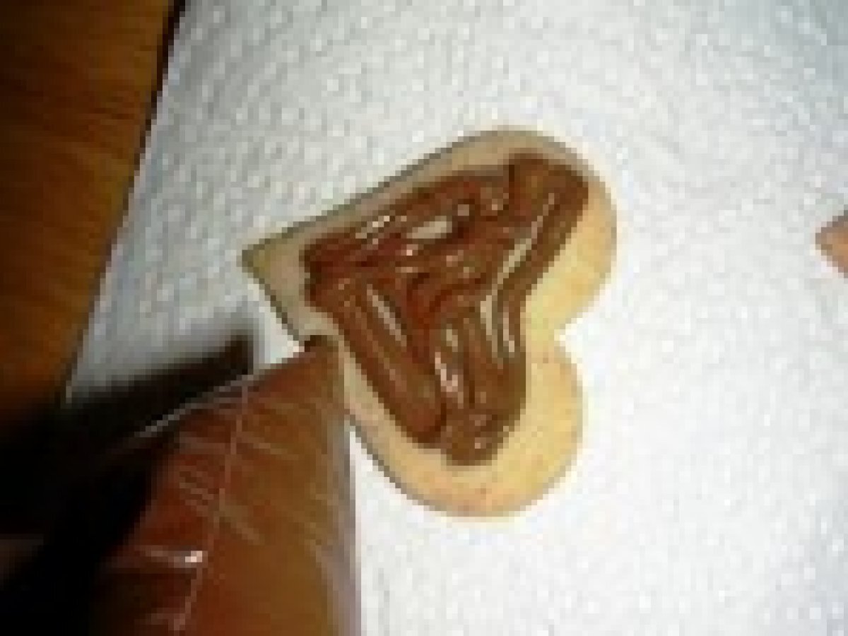 - Ein kleines Löchlein in den Beutel schneiden. Auf ein Herz etwas Nougat geben, ein zweites Herz aufsetzen. So alle Herzen füllen. Anschließend kühlen, bis das Nougat wieder fest ist.