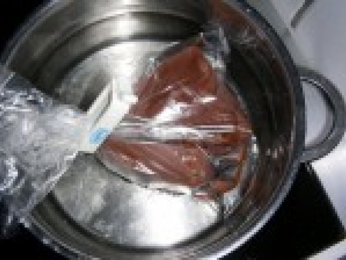 - Inzwischen den Nougat in einen Gefrierbeutel geben. Diesen mit einer Klemme oder einem Gummiband verschließen und in eine Schüssel mit heißem Wasser setzen. Den Beutel hin und wieder durchkneten und warten, bis das Nougat geschmolzen ist.