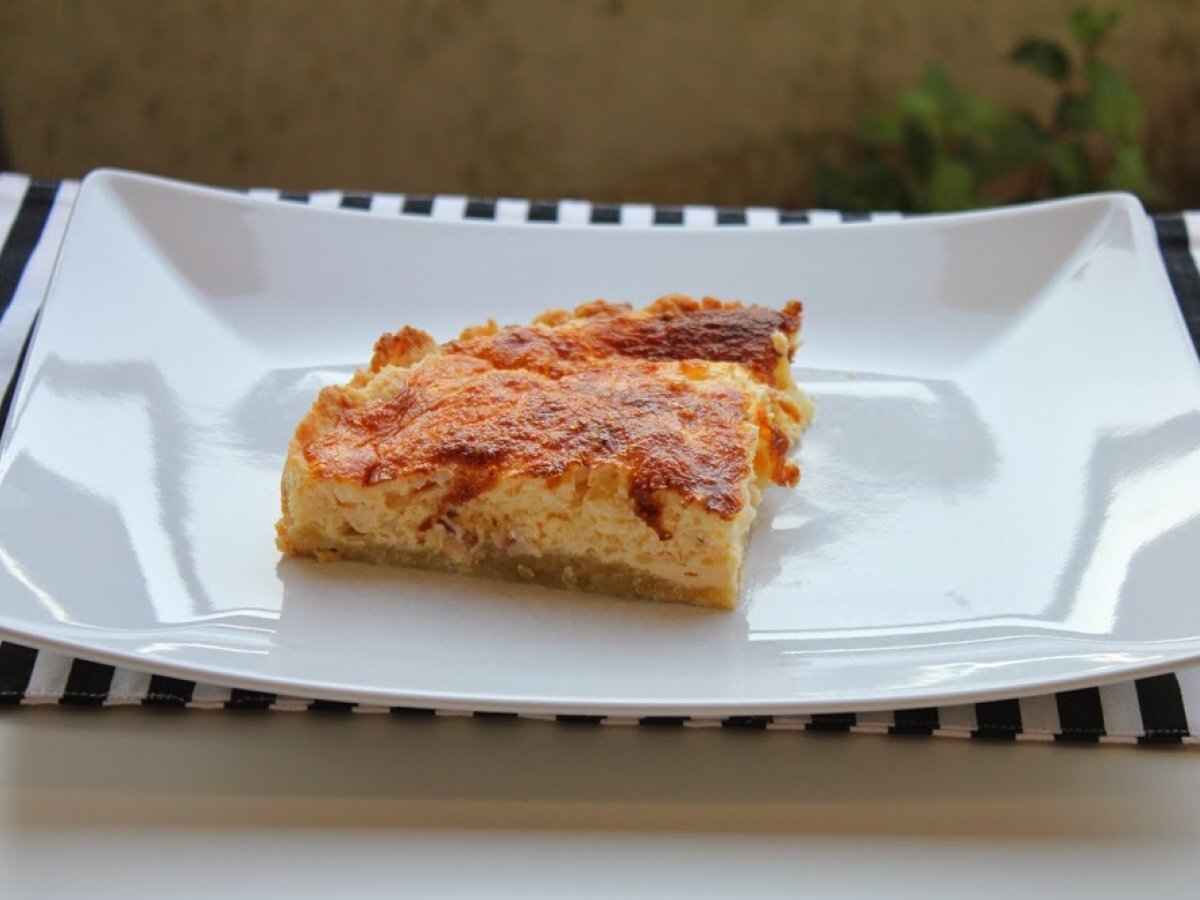 - Die Schinkenkäsemischung auf dem Teigboden verteilen und mit der Eiersahnemischung auffüllen.