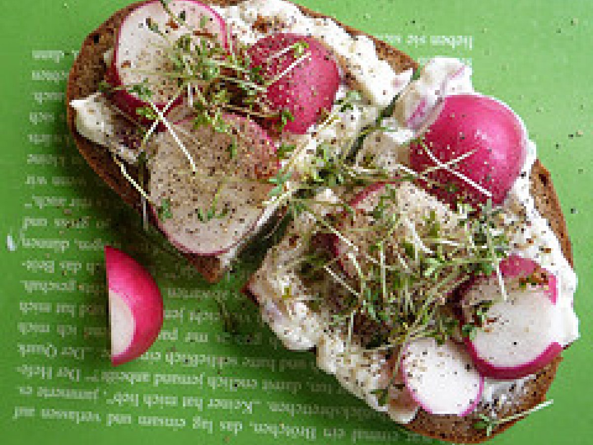 Brote mit zwei in scheiben geschnittenen radieschen belegen & mit kresse bestreuen.