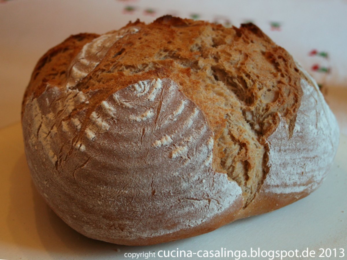 - Den gereiften Brotteig aus der Form stürzen und auf den heißen Backstein geben. Nach 10 Minuten Backzeit die Temperatur auf 180 °C herunterstellen und das Brot noch ca. 45 Minuten backen. Nach dem Backen gut auskühlen lassen.