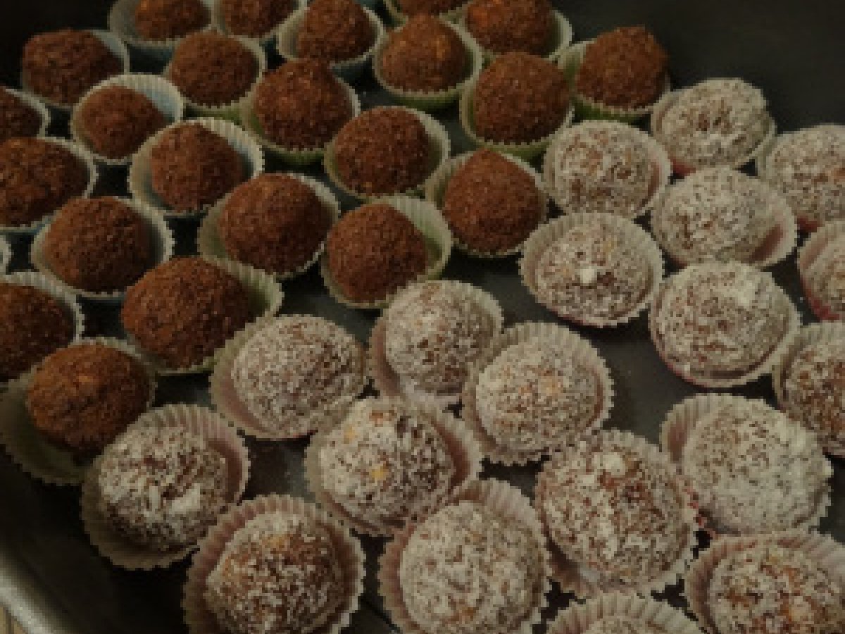 - Nüsse / Schokolade Mandeln, Zucker und Rum in eine glatte Paste Prozess Diese Masse wird nun bilden kleine, Kugerln Uniform, ist, dass in Streuseln, Schokoladenchips oder geriebene Kokosnüsse verteilt sind; Kugerln legt es dann in Kapseln hergestellt, Süßigkeiten und einen kühlen, trockenen Ort für zwei Tage in der Luft trocknen gelassen; danach werden sie in einem geschlossenen Kasten bleiben ca. 3 Wochen haltbar