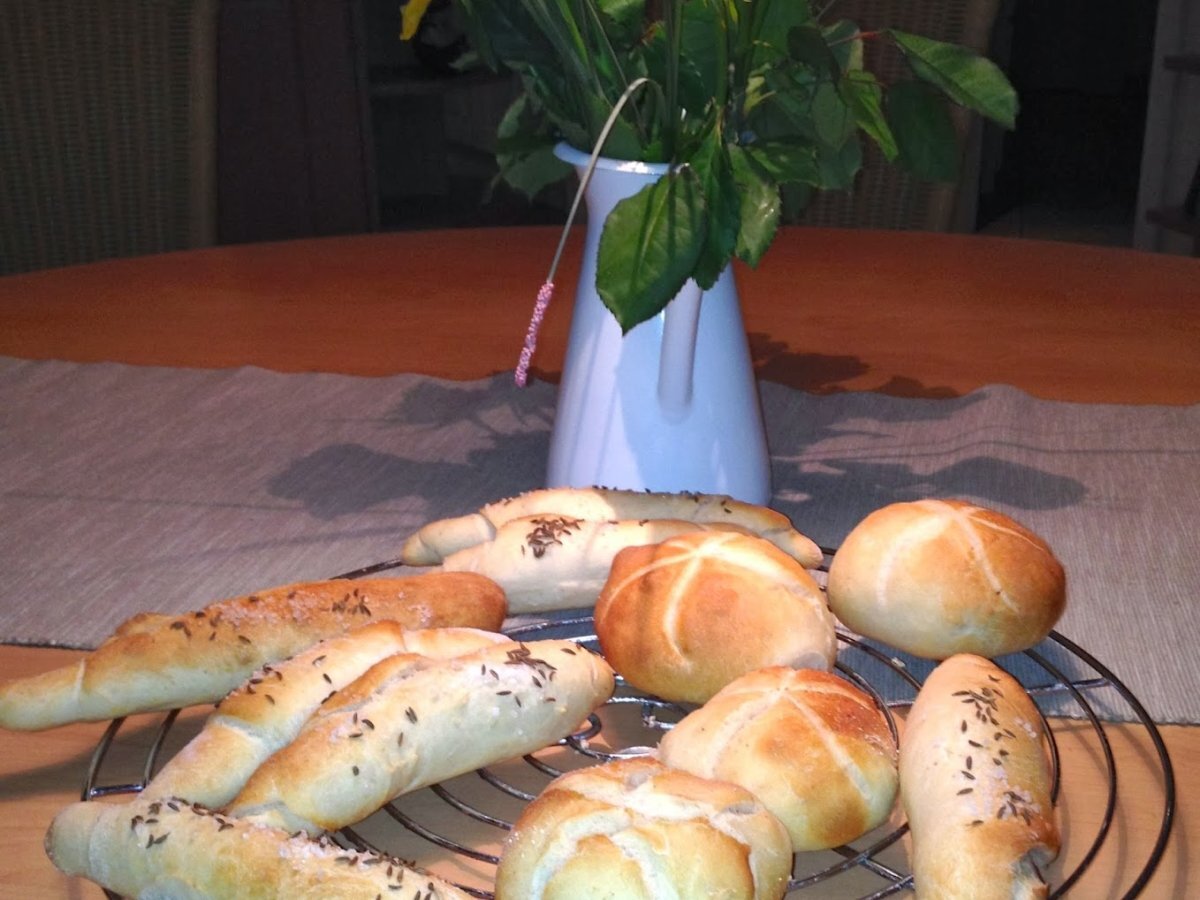 mit grobem Salz und Kümmel bestreuen. - Die Semmeln natürlich nicht! Im vorgeheizten Rohr bei 220 °/ 20 Min. backen Unbedingt ein Schüsselchen mit heißem Wasser reinstellen!