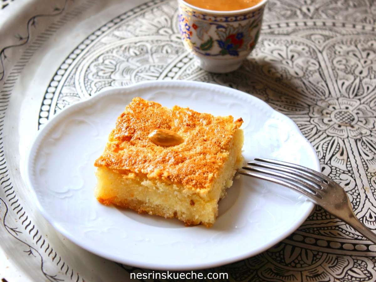 Eine viereckige Backform mit Tahini bestreichen. - Für den Kuchen die trockene Zutaten in einem Rührschüssel vermischen. Sahnejoghurt geben, alle Zutaten glatt rühren und in die Backform gießen.