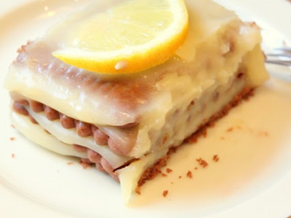 - In einer vierseitigen Schale aus einer Schicht aus dunklem Shortbread legen, gießen Sie eine Schicht von Zitronencreme.