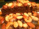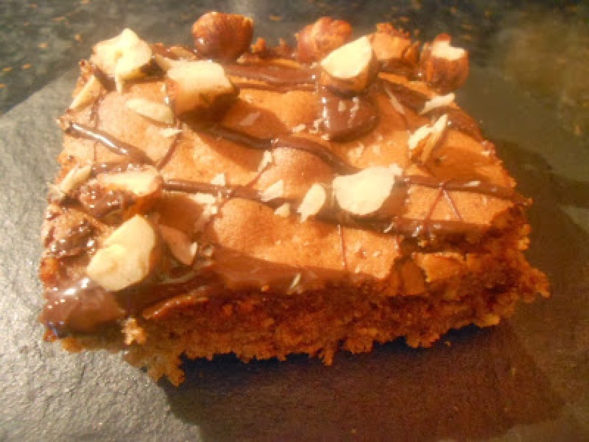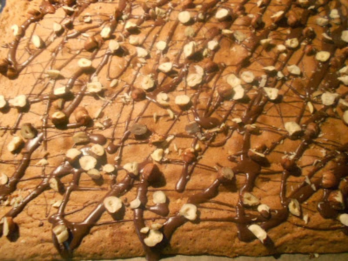 - Die flüssige Schokolade, dann fügen Sie das Mehl, Nüsse und Gewürze einrühren. Gießen Sie die Mischung auf ein Backblech ausgekleidet und glätten.