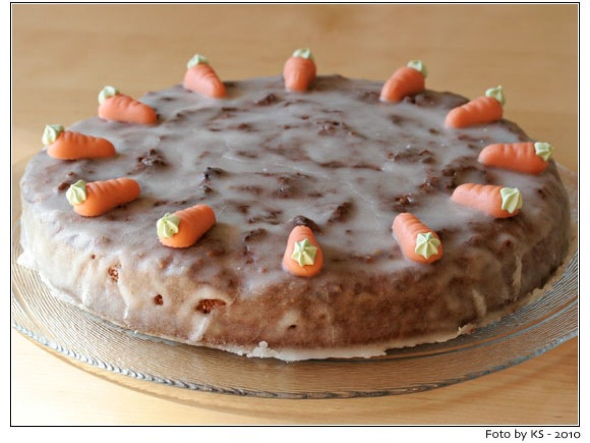 - Setzen Sie den abgekühlten Kuchen mit ihm und dekorieren mit einem kleinen Marzipanmöhrchen.