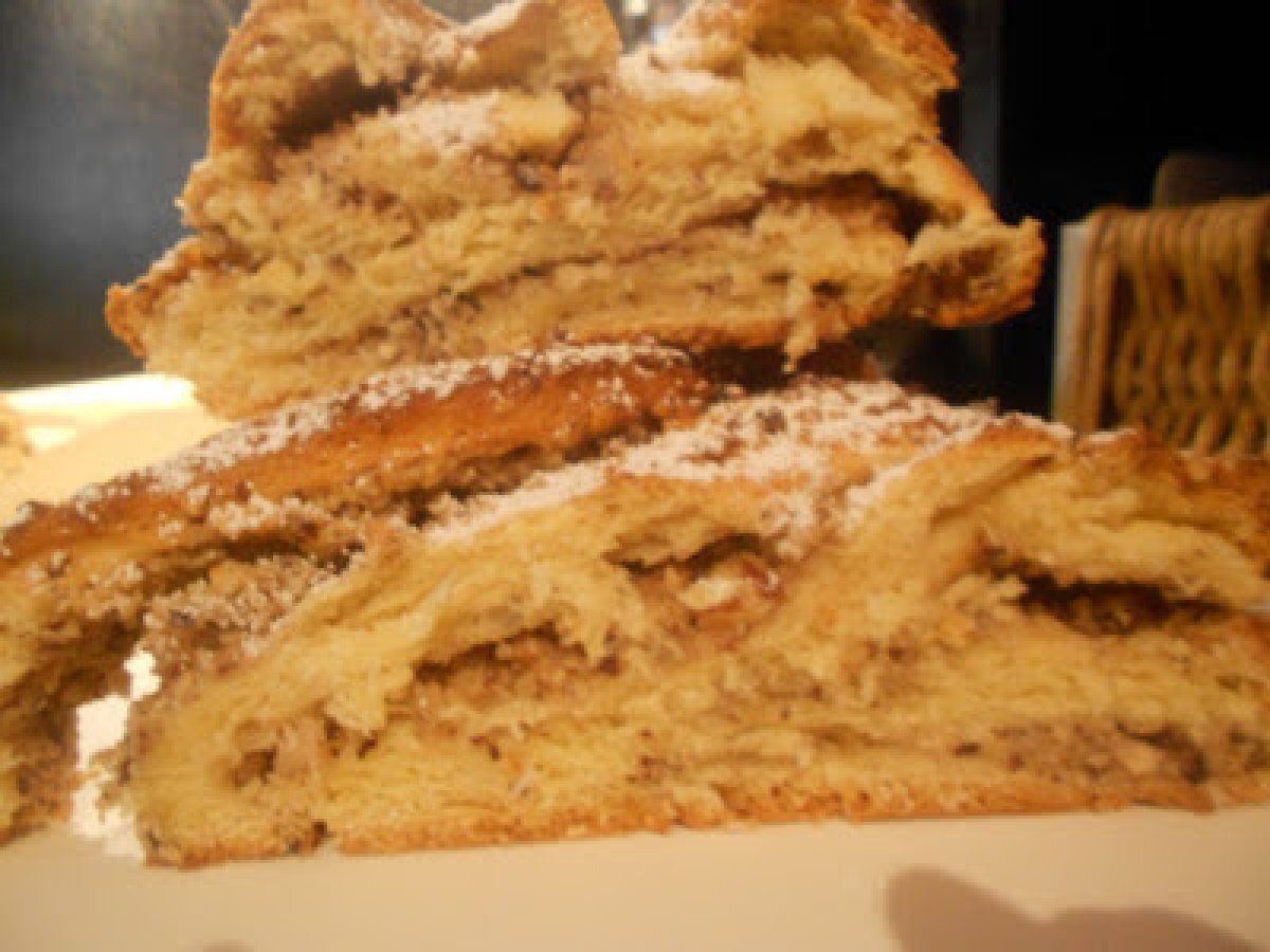 - Den Teig ausrollen, mit der Fülle bestreichen, zusammenrollen, einschneiden und flechten, mit dem versprudelten Ei bestreichen, Luftlöcher einstechen, nochmals etwas gehen lassen und bei 180°C Umluft ca. 30 Min. backen.
