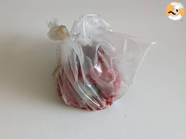 Aus dem Ofen nehmen und die Paprikaschoten in einem verschlossenen Gefrierbeutel vollständig abkühlen lassen (etwa 10 Minuten).