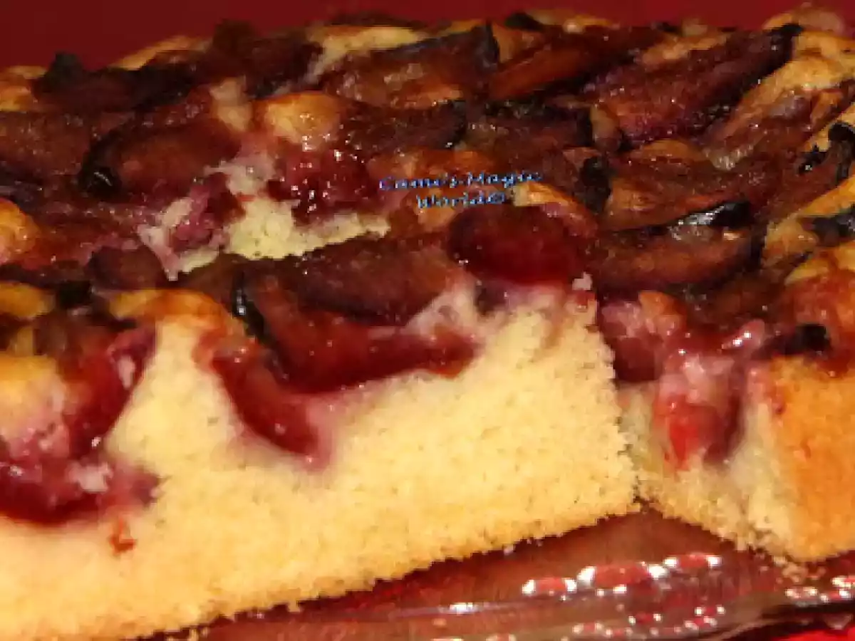 - Gießen Sie die Mischung in eine Backpapier Backform (26 cm) zu füllen verteilen Pflaumen auf es mit einer Prise Zimt Esslöffel Puderzucker- und etwa 45 Minuten.