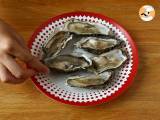 Öffne die Austern. Entfernen Sie das erste Wasser. Sammeln und filtern Sie das zweite Wasser von 2 Austern. Sammeln Sie das Fruchtfleisch der Austern und schneiden Sie es grob in Stücke.