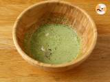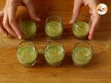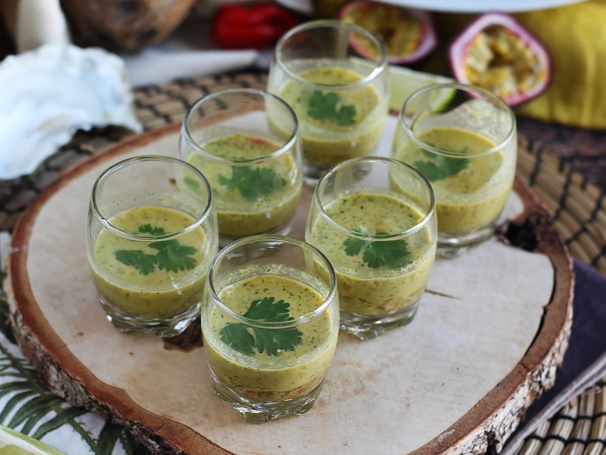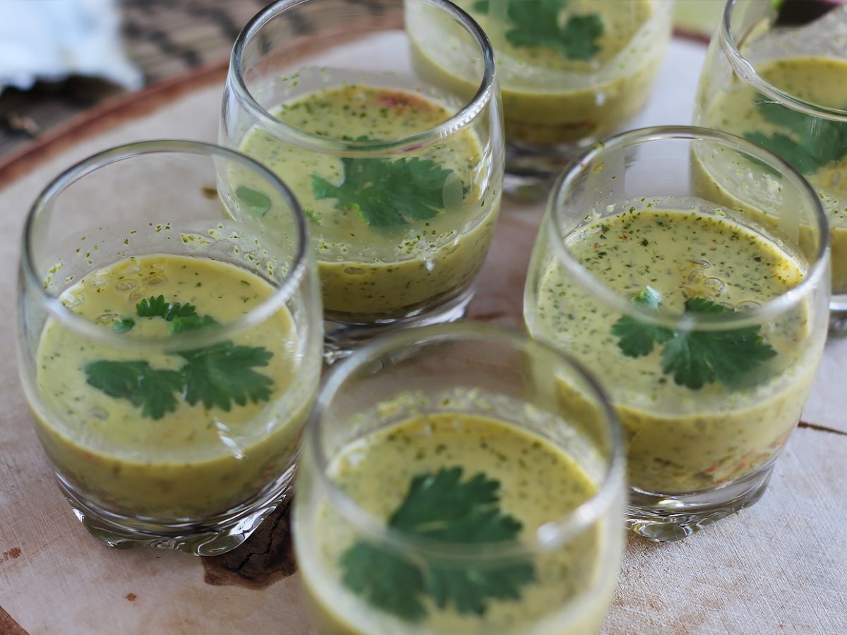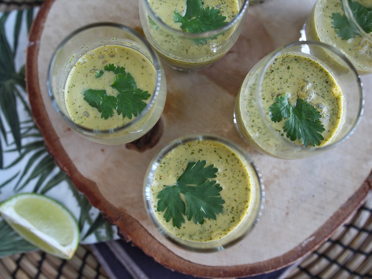 Die Gläser mit einem Korianderblatt dekorieren, fertig!