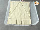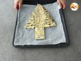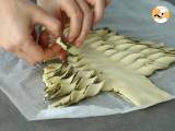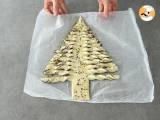 Mit einem zweiten rechteckigen Blätterteig bedecken und die Form des Baumes ausschneiden. Lassen Sie die Enden abgeschnitten.