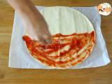 Falten Sie den Teig in der Mitte, sodass die Tomatensoße bedeckt ist. Schneiden Sie 1 cm breite Streifen.