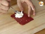 Auf jede Scheibe Bündnerfleisch 1/3 großzügig mit Frischkäse auftragen.