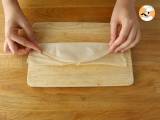 Schneiden Sie die Teigblätter in zwei Teile. Falten Sie den abgerundeten Teil, sodass ein rechteckiges Teigblatt entsteht.