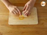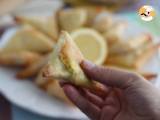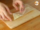 Nochmals falten, bis ein kleines Blatt übrig bleibt. Bestreichen Sie den restlichen Blattteil mit geschlagenem Ei, falten Sie ihn zusammen und drücken Sie ihn nach unten, um die Samosa zu schließen.
