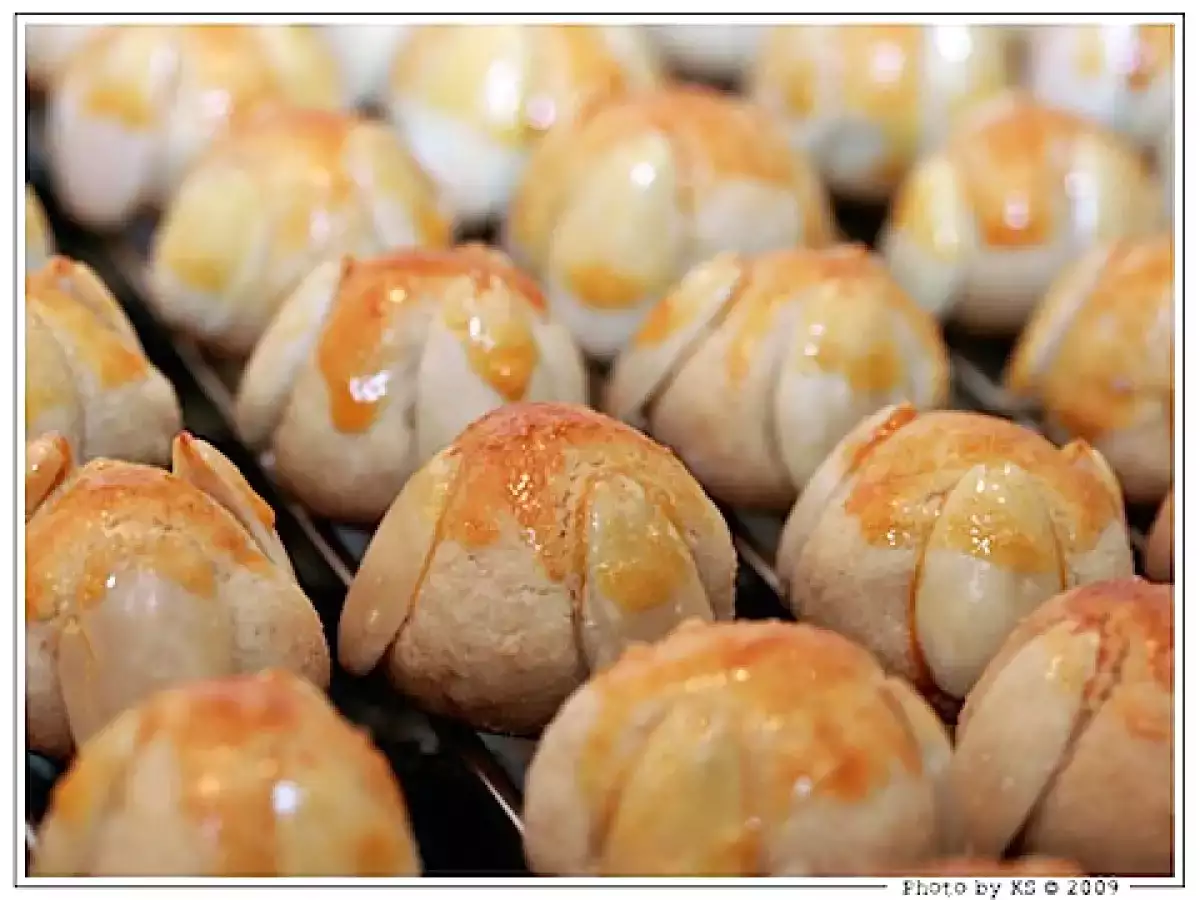 Halbieren 7. Mandeln und drücken Sie vorsichtig drei Halbkerne auf jedem Ball. - Eigelbe mit dem Rosenwasser und alle? Cookies? das obere Ende der Bürste als auch.