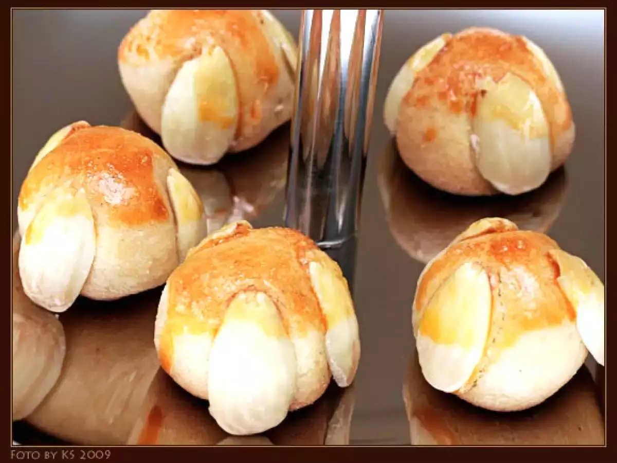 Aus der Mischung zu kleinen Kugeln. Der Teig ist sehr klebrig, was normal ist. Mit bemehlten Händen leicht, aber es kommt ziemlich gut. - Ofen vorheizen auf 175 ° Ober- / Unterhitze.