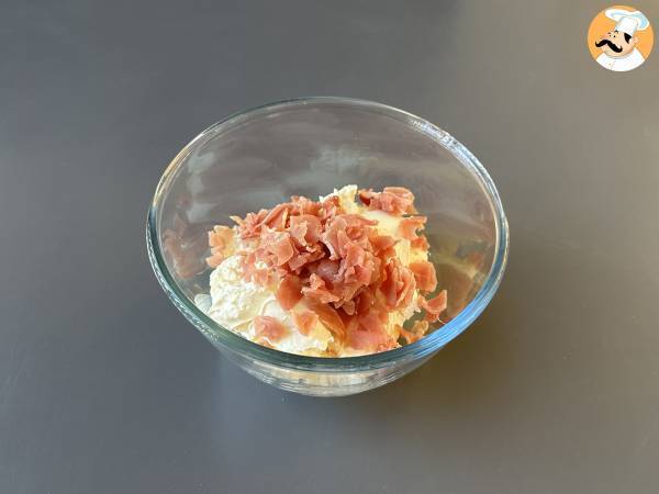 Den Frischkäse und den in kleine Stücke geschnittenen Parmaschinken in eine Schüssel geben. Gut mischen.