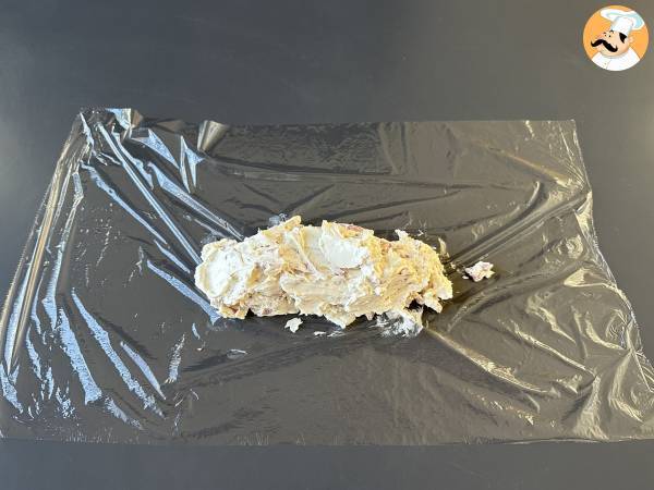 Öffnen Sie ein Stück Frischhaltefolie auf dem Tisch. Dann die oben genannte Mischung in die Mitte geben.