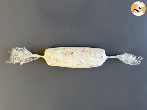 Einwickeln und aufrollen wie eine Salami. Etwa 30 Minuten im Kühlschrank kühlen, bis sie fest sind.