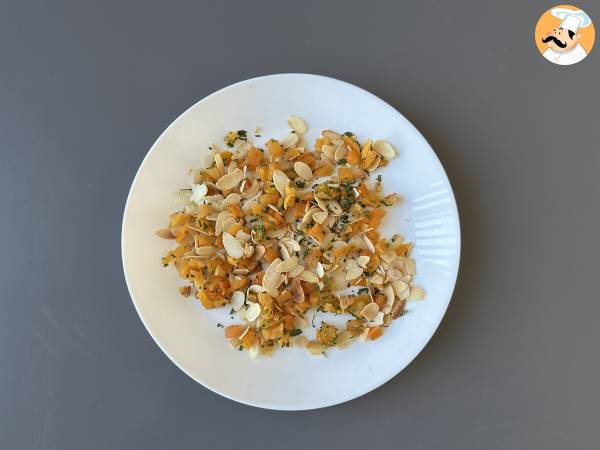 Die gehackten Aprikosen, die gerösteten Mandeln und die Petersilie in einer flachen Schale mischen.