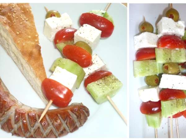 Für die nächste grillparty: griechischer salat am spieß