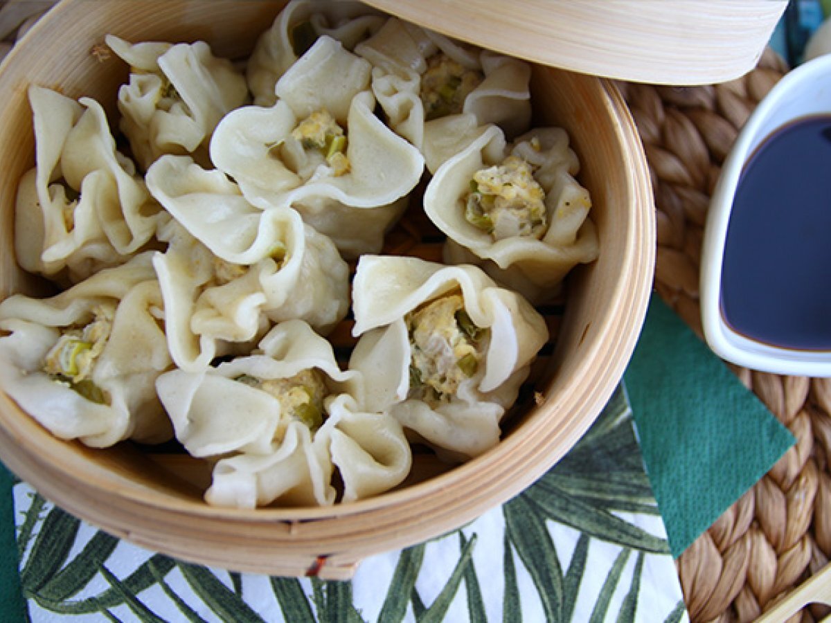 Füllung: Zwiebeln hacken. Hähnchen hacken oder bereits gehacktes Hähnchen verwenden. Zwiebeln und Hühnchen mit Speisestärke, Glutamat (oder Salz), Sojasauce und Pfeffer mischen.