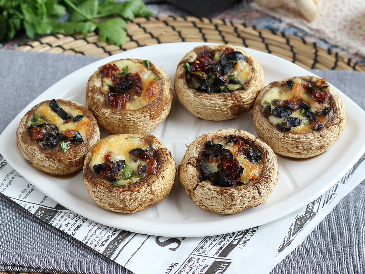 Für die Füllung benötigen Sie Champignons, Mozzarella, schwarze Oliven, getrocknete Tomaten, Knoblauch, Parmesan, Petersilie und Pfeffer.